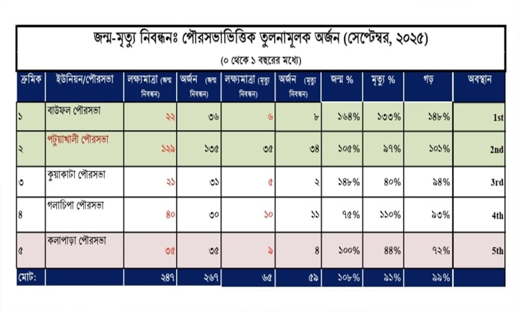 তাদের অর্জন ১০১ শতাংশ। কুয়াকাটা, গলাচিপা এবং কলাপাড়া পৌরসভার অবস্থান যথাক্রমে তৃতীয় ৯৪ শতাংশ, চতুর্থ ৯৩ শতাংশ ও পঞ্চম ৭২ শতাংশ।