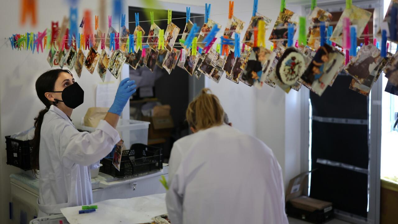 At a nearby table, other students carefully dismantle warped albums or disinfect and clean faded photographs, which are then hung to dry.