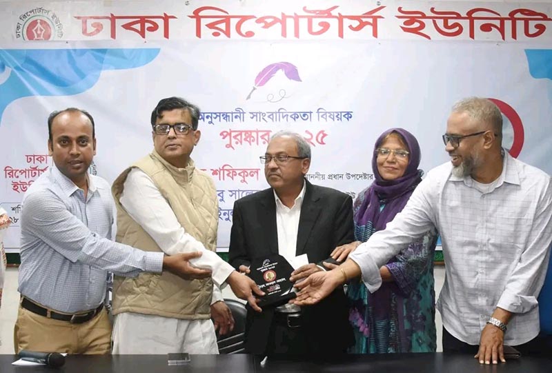 Earlier on November 28, he received a crest and a cheque of Tk 1 lakh from Chief Adviser's Press Secretary Shafiqul Alam at the DRU awards ceremony. DRU President Abu Saleh Akon, General Secretary Mainul Ahsan Sohel, executive committee members, senior journalists and his spouse Begum Zinat Mahal Chowdhury were present at the event.